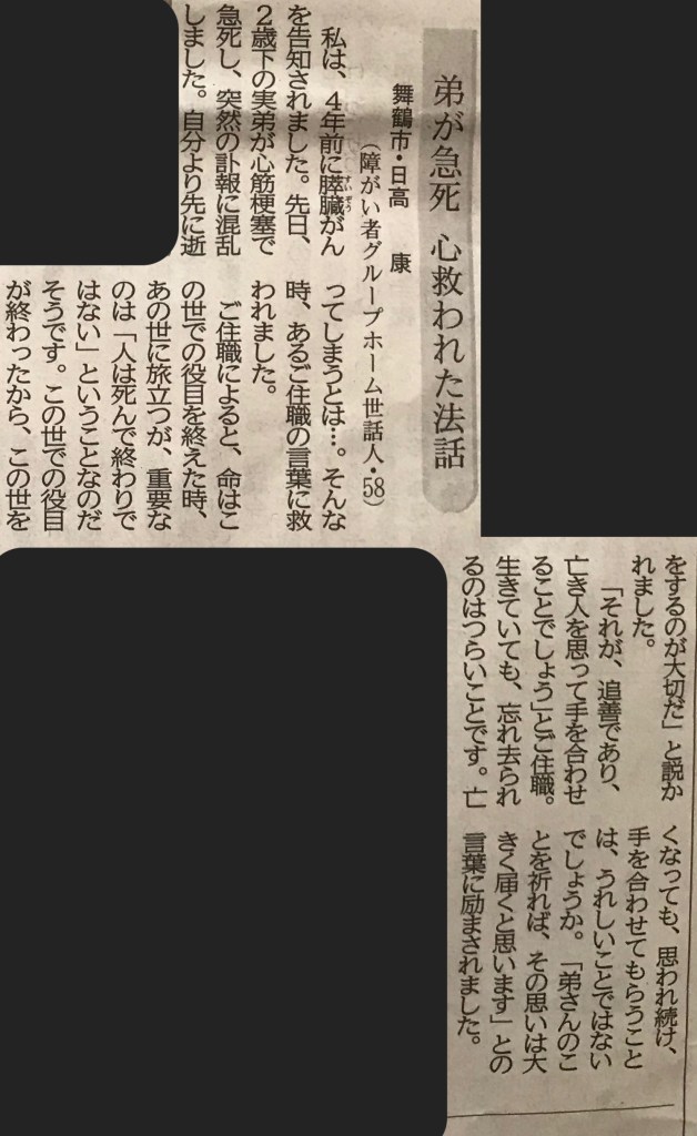 なんと、その記事をみた読者が、「障害者グループホーム世話人・日高・舞鶴」というキーワードだけを頼りに、日高さんを探されるのです。というのも、その方も、ガンを患われ苦しみの最中で、日高さんの記事をみて救われたそうです。
